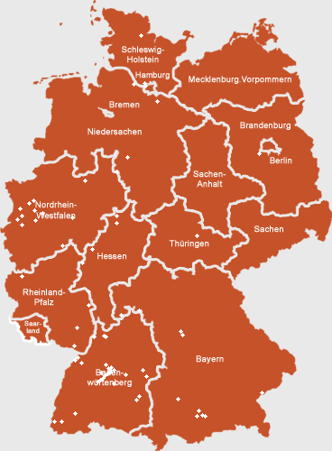 Die ZentrenDie Übersicht über die Landschaft der ökumenischen Kirchen- und Gemeindzentren in Deutschland finden Sie hier. Sie ist Ergebnis einer Befragung des Lehrstuhls Praktische Theologie der Ruhr-Universität Bochum an die Landeskirchen der EKD aus dem Jahr 2000. Sie wurde durch die Liste der Ökumenischen Gemeindezentren in Deutschland der Ökumenischen Centrale Frankfurt sowie durch Internet-Recherchen ergänzt und wird ständig aktualisiert. Bei Änderungswünschen der Bestandsübersicht wenden Sie sich bitte an Pfarrer Gerald Hagmann hagmann@oekumenisch.de. Eine Auflistung ökumenischer Kirchen- und Gemeindezentren eines Bundeslandes erhalten Sie durch Auswahl eines Landes auf der nachfolgenden Karte.
